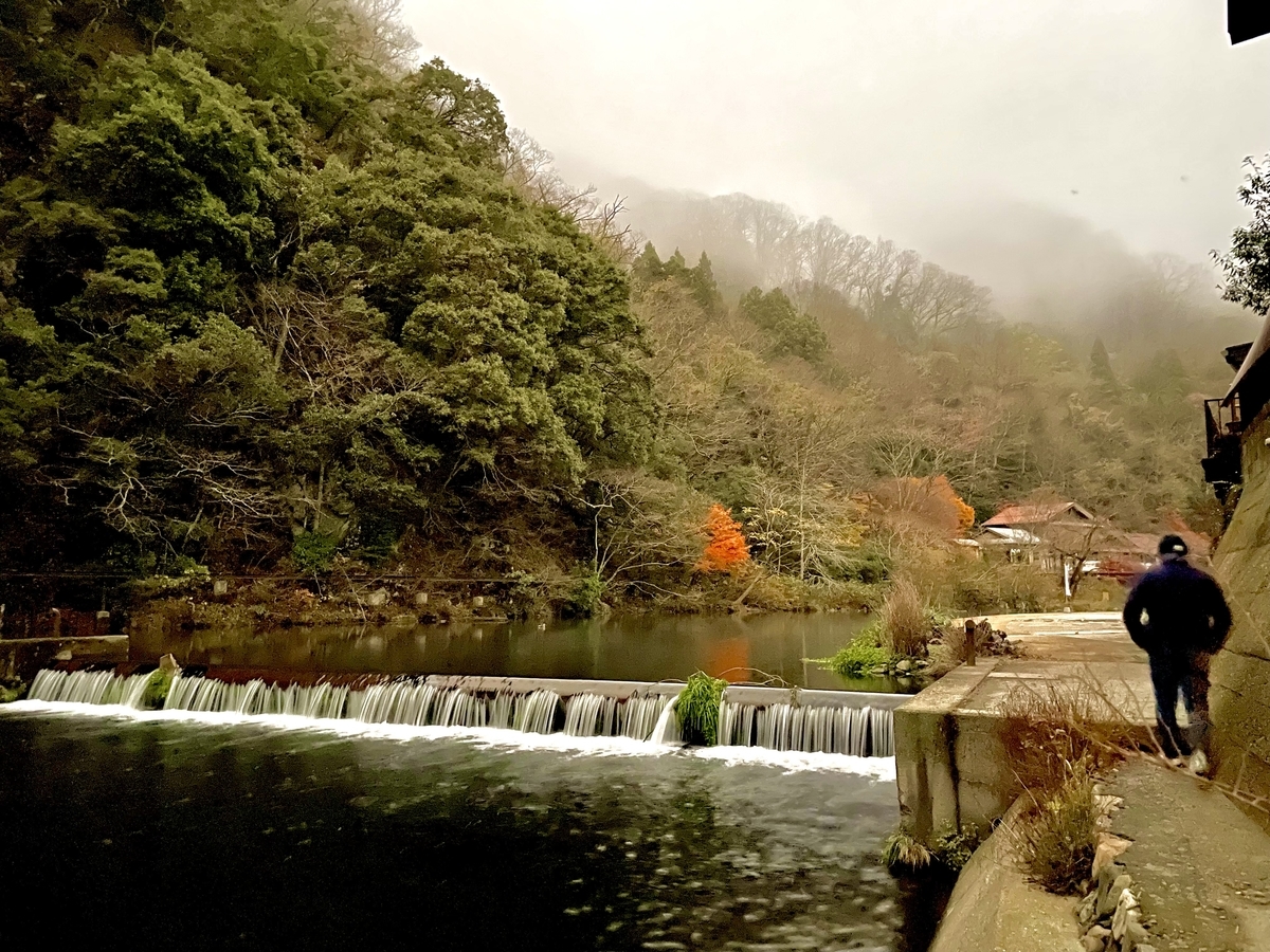 岡山・湯原温泉で目覚めた朝。夜は宿の前でライトアップされた紅葉を楽しみましたが、翌日は朝霧に包まれた温泉街を散策することに。